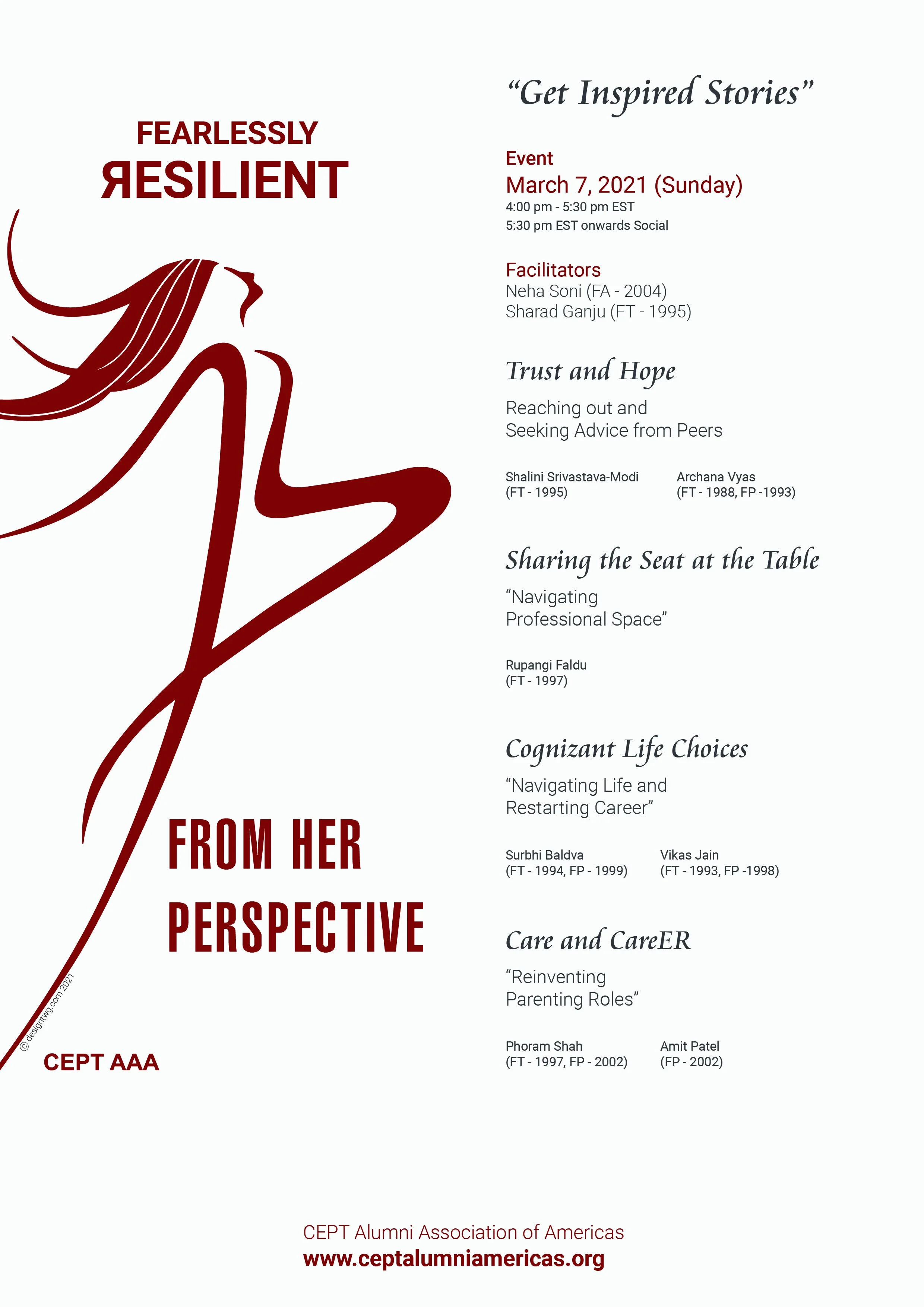 The key objective of the initiative is to connect, support and empower CEPT Women Alumni in the Americas! The idea is to share the inspiring stories of unapologetically resilient CEPTAAA women, who achieved their personal and professional goals, took the roads less traveled and explored uncharted territories, challenged the cultural norms while contributing significantly to the field. The intent here is to bring different women voices to the table and share unheard stories.